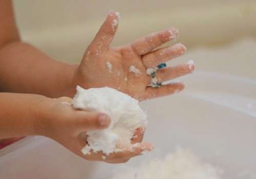 3. Mélangez bien à l’aide d’une cuillère ou avec des petites ou grandes mains. Si la neige est trop sèche, ajoutez un peu de mousse à raser; si elle est trop liquide et elle ne colle pas du tout (car il faut pouvoir faire des boules de neige !), rajoutez du bicarbonate.